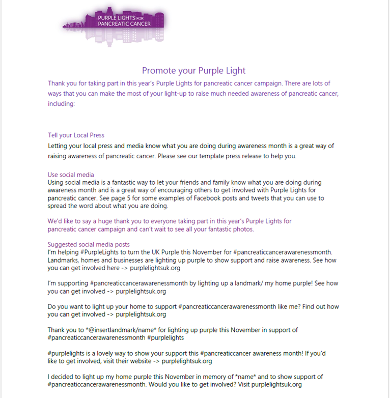 Whether you or someone close to you has been personally affected, taking part in Purple Lights for pancreatic cancer is a touching way to pay tribute to them as well as raising much needed awareness of the disease.